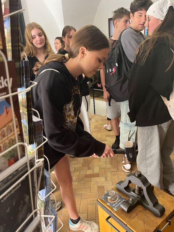 Zde jsme v expozici věnované výrobě blanenské umělecké litiny potrápili naše mozkové závity luštěním několika šifer. Všechny se nám podařilo vyluštit, a tak jsme si na závěr mohli vyrazit vlastní denár a odnést si ho domů jako suvenýr.