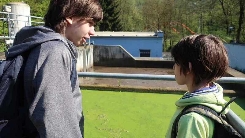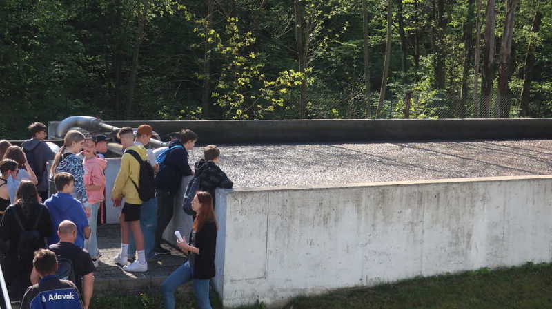 Po přednášce se všichni přemístili přímo k čističce, kde si žáci mohli prohlédnout jednotlivé části čističky a paní Lukášová jim popsala, jak se voda čistí a kam se vyčištěná voda vypouští.