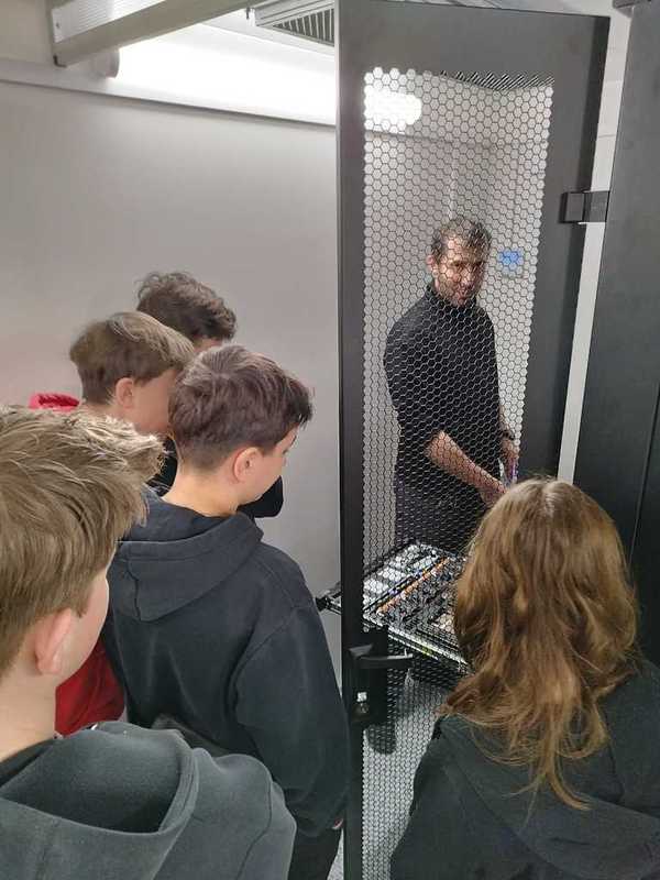 Zajímavost u žáků vzbudilo zázemí serverovny. Je to speciální místnost, kde se nachází datacentrum – servery. Server je zjednodušeně řečeno počítač (hardware), který poskytuje nějaké služby; případně to je program (software), který služby „realizuje“. Server jakožto „železo“ je vidět na fotce s žáky a zaměstnance firmy. Je to veliká skříň, v níž najdete spoustu menších fyzických počítačů (serverů). Na nich běží aplikace, které firma poskytuje svým klientům – např. Mergado editor, BiddingFox, Feed Image Editor a další. Vyžadují neustálé připojení k elektrické síti, internetu, klimatizaci a dohled člověka.