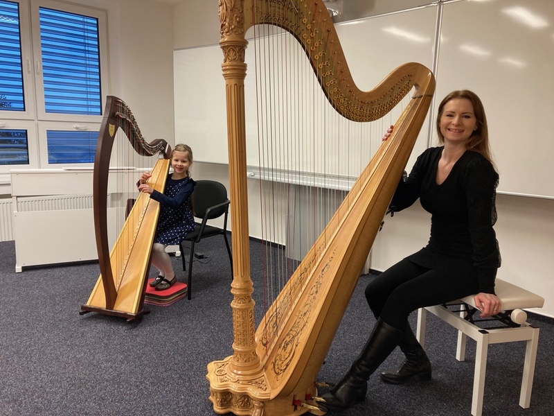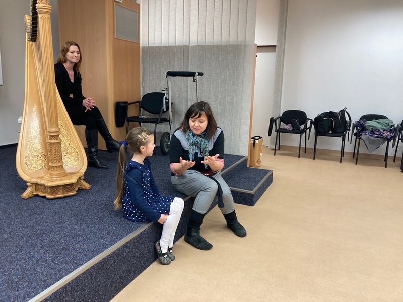 Moc zajímavé pro nás bylo, že jednou z hudebnic byla maminka Amálky z 1. B – harfenistka Ivana Švestková. Ještě větším překvapení bylo, když se v naší koncertní (multifunkční) místnosti objevily harfy hned dvě – velká a malá. Paní Švestková s dcerou nám společně zahrály. Hodně dětí bylo moc překvapených, že malá holčička z 1. třídy má svoji harfu a pod vedením maminky už na ni trénuje. Pro většinu dětí to bylo úplně první setkání s harfou.