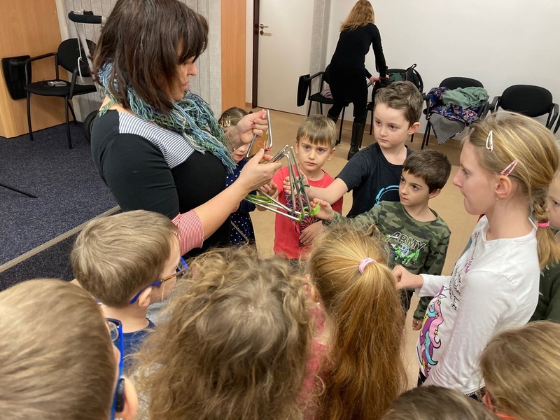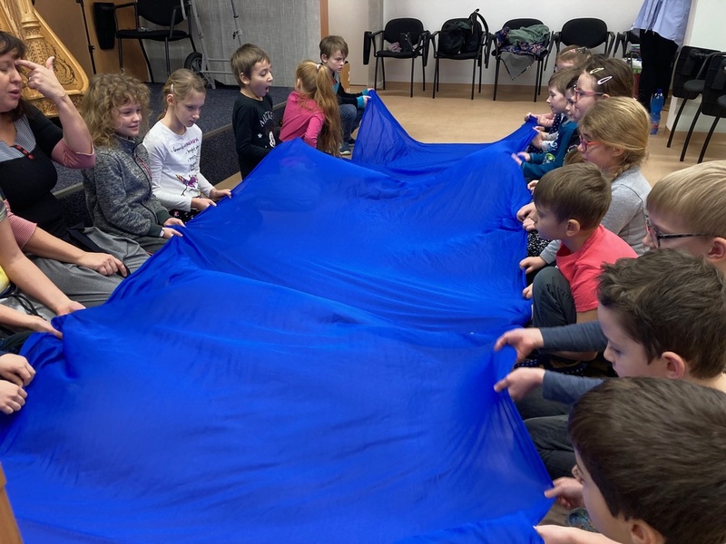 Pod vedením paní Drášilové si žáci vyzkoušeli doprovázet harfu na triangly. Po rozmotání velkého modrého pruhu látky si také zahráli na řeku Vltavu.