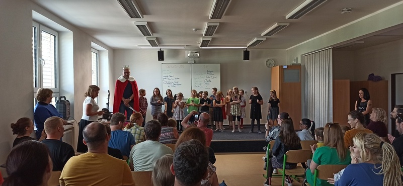 V 1. A proběhlo pasování 6. 6. 2023 v promítací místnosti plné rodičů. Úvodem jsme společně přivítali nejen rodiče, ale i samotného krále Otu I., který k nám dorazil ze samotného Království čtenářů, aby mohl naše prvňáčky pasovat na čtenáře. Program děti zahájily recitací básničky Delfínci. Následovalo společné čtení pohádky Maxipes Fík ve škole. Prvňáčci předvedli, že si titul čtenář opravdu zaslouží, a tak nebránilo nic samotnému pasování. Na závěr žáci zarecitovali básničku na rozloučení s první třídou a odebrali se do třídy na malé občerstvení.