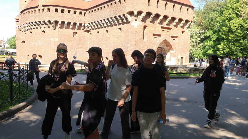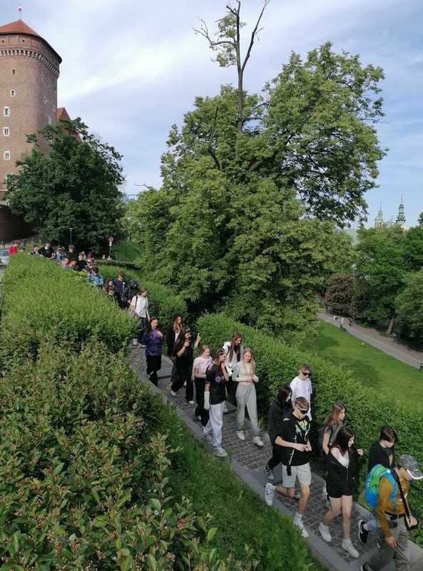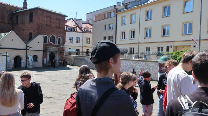 Prohlídku metropole historického Malopolska jsme začali procházkou v židovské čtvrti Kaziměř, kde jsme viděli všechny významné synagogy a žáci dostali vice jak půlhodinové volno na Novém náměstí na občerstvení po tak dlouhé cestě. Přes hradní vrch jsme se přesunili do historického centra města - prošli se kolem několika významných kostelů a na Hlavním náměstí dostali hodinový prostor na prohlídku domu soukeníků a jiných zajímavostí. Pár jedinců navštívilo radniční věž. Poté pokračovals prohlídka města průchodem Floriánské brány a kolem barbakanu k historické budově Jagellonské univerzity. Následně jsme vyšlapali znovu na hradní vrch, kde jsme měli půlhodinku na obhlídku hradu Wawel. Večer jsme se přesunuli na ubytování do hostelu na okraji Krakova.