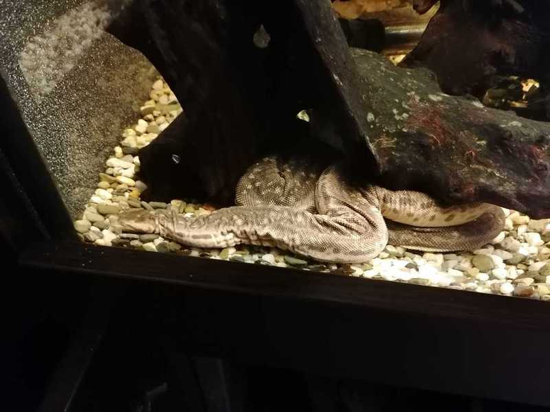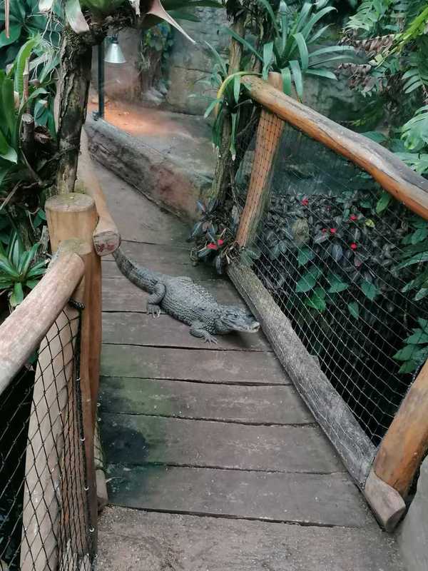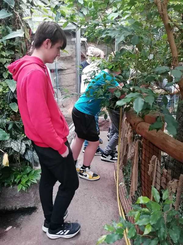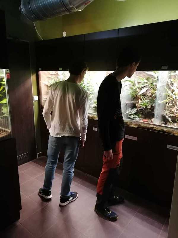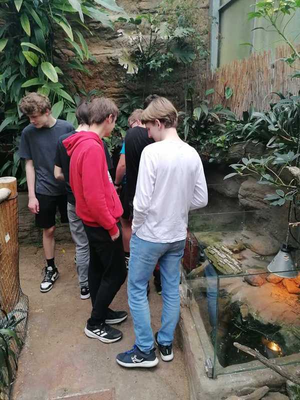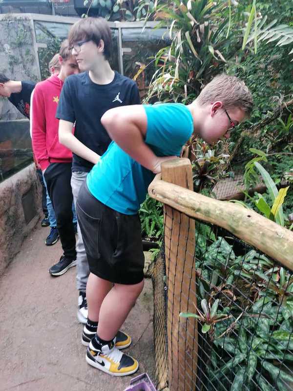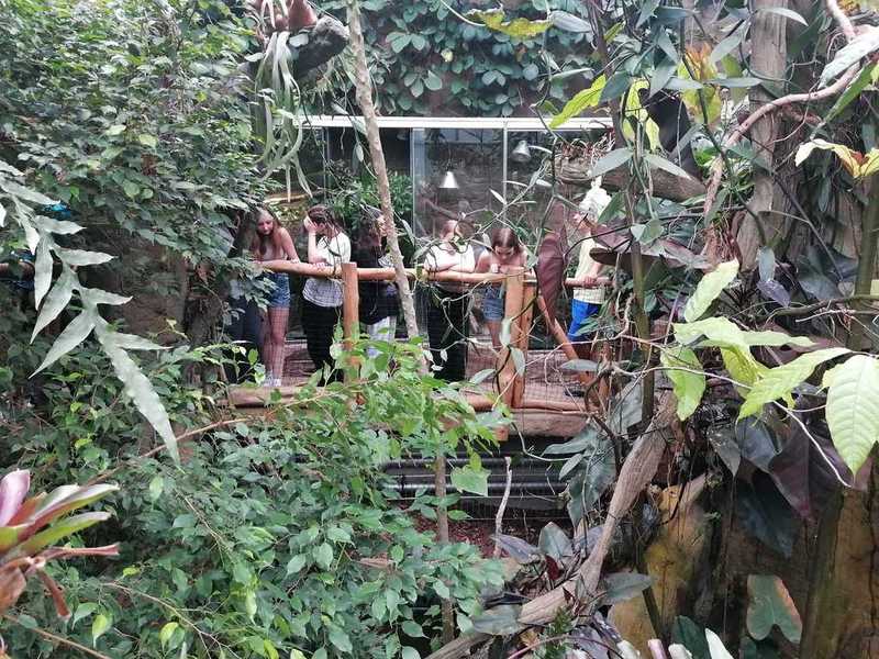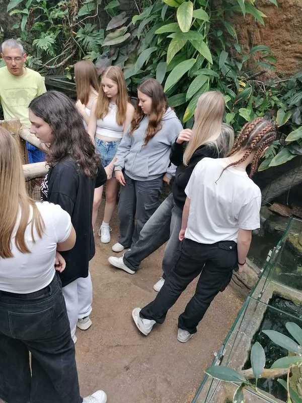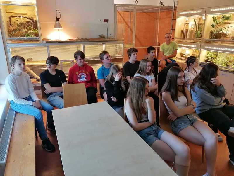 Ve druhé části navštívili žáci suterén s terárii, ve kterých mohli vidět mnoho druhů žab, mezi nimi i známé barevné pralesničky, a vodní druh hada bradavičníka jávského. Pak jsme se přesunuli do tropického skleníku, kde kromě vanilky a liány bylo možné vidět i kajmana brýlového, leguána zeleného, varana, různé druhy želv a hroznýšovitých hadů – např. krajtu kobercovou a hroznýše královského.