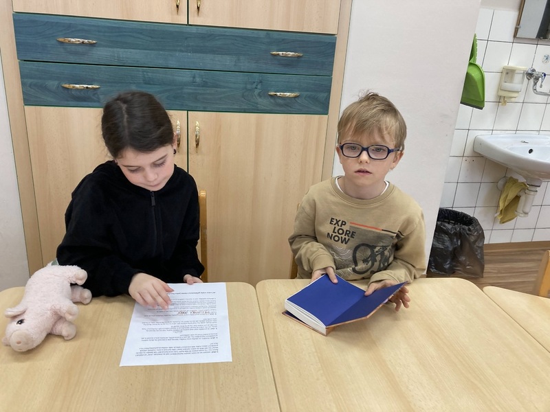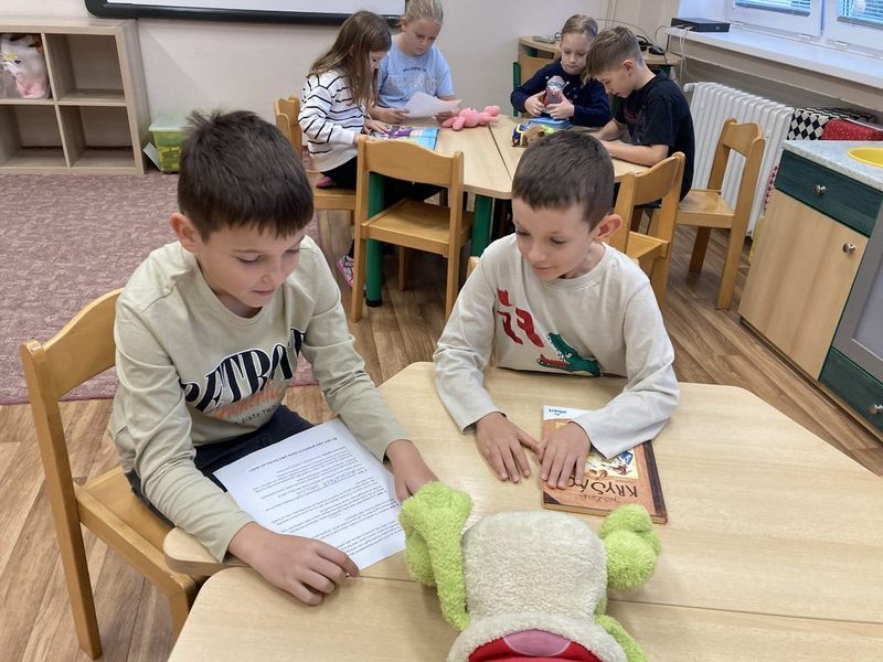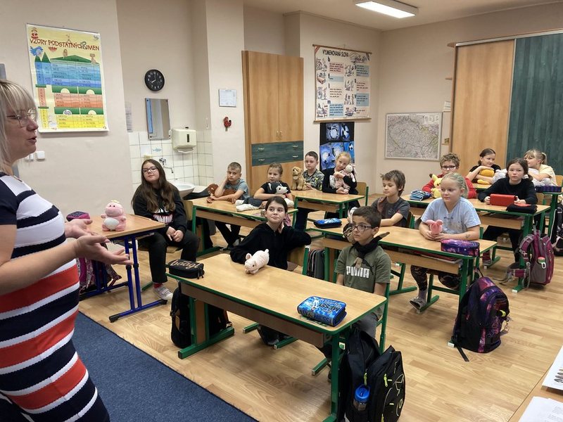 A ve středu 15. října jsme si měli přinést svého oblíbeného plyšáka. Já mám toho svého od narození. Nejdřív přišli k nám do 4. B třídy prvňáčci a zazpívali nám Nikolo, vem kolo. Potom si sedli naše místa a my zazpívali a zatančili jim Evelínu. Každý tak „získal“ prvňáčka, který seděl na jeho židli. Potom jsme za nimi šli do jejich 1. B. Ptal jsem se, jak se jmenuje, kde bydlí, kolik mu je, jaký je jeho nejlepší kamarád a také jsem mu přečetl stránku z jeho oblíbené knížky, kterou si přinesl. Potom jsme šli spolu hledat do družinky schovanou houbu, kterou si můj mladší kamarád vybarvil.