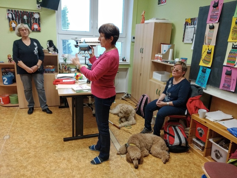 Přišly za námi na besedu paní Helena Hádlerová (z Černé Hory) s pejskem Charlottou, slečna Kateřina Kubínová s pejskem Megy a jejich doprovázející kolegyně Jarmila Sedláčková ze SONS (sjednocené organizace nevidomých a slabozrakých) z Blanska. Paní Helena a Katka jsou nevidomé.