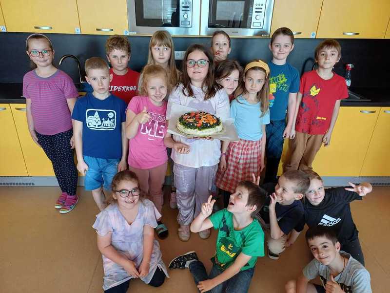 Založili jsme školní kompostér a záhony, které místo klasického rytí zušlechťujeme pomocí mulče. V letošním roce jsme se třídou 2.B vypěstovali krásný špenát, ze kterého jsme upekli mechový dort ozdobený ovocem a jedlými květy.