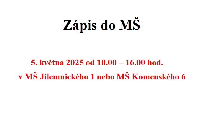 1)osobním podáním dne 5. května 2025 od 10.00 – 16.00 hod. v MŠ Jilemnického 1 nebo MŠ Komenského 6